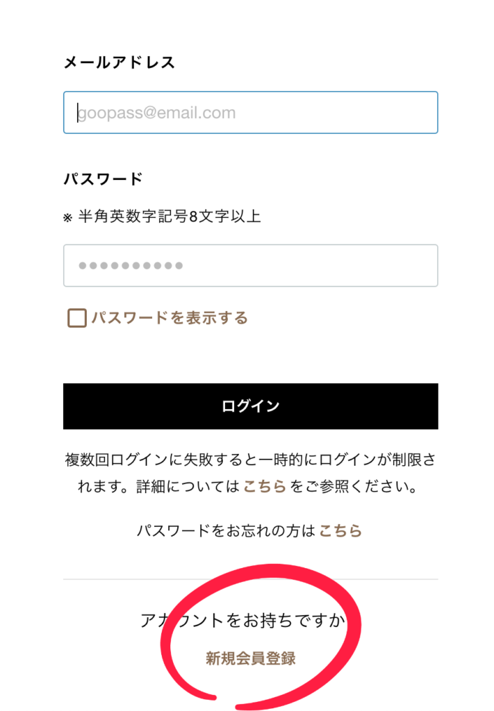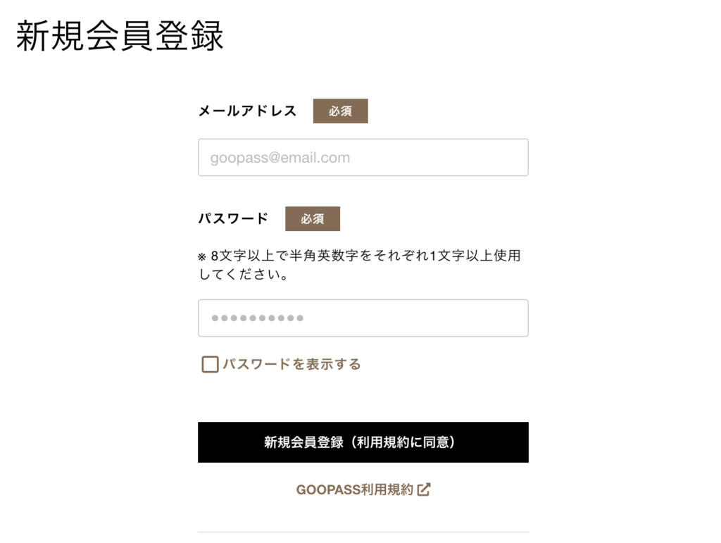 GOOPASSの公式サイトにアクセスし、右上の「ログイン」→「新規会員登録」と進みます。