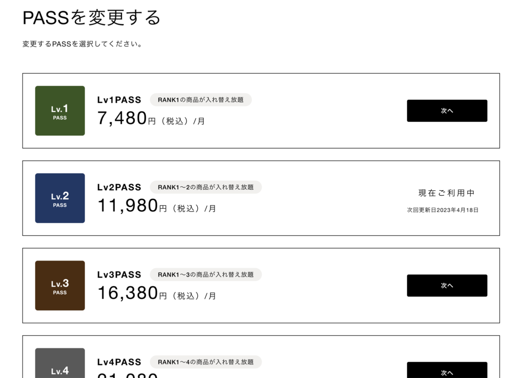 | パスのLv | 月額料金(税込) | レンタル可能RANK |