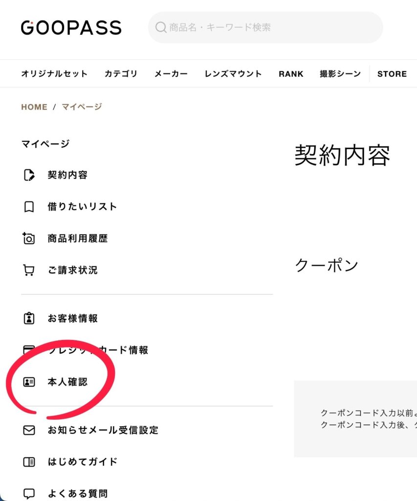 レンタルを行うには本人確認が必要です。マイページの「本人確認」から進みます。