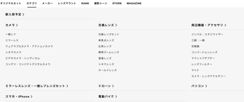 約2,500種類の機材を取り扱っており、ミラーレスカメラからレンズ、三脚、ジンバル、ドローン、アクションカメラまで幅広くラインナップされています。