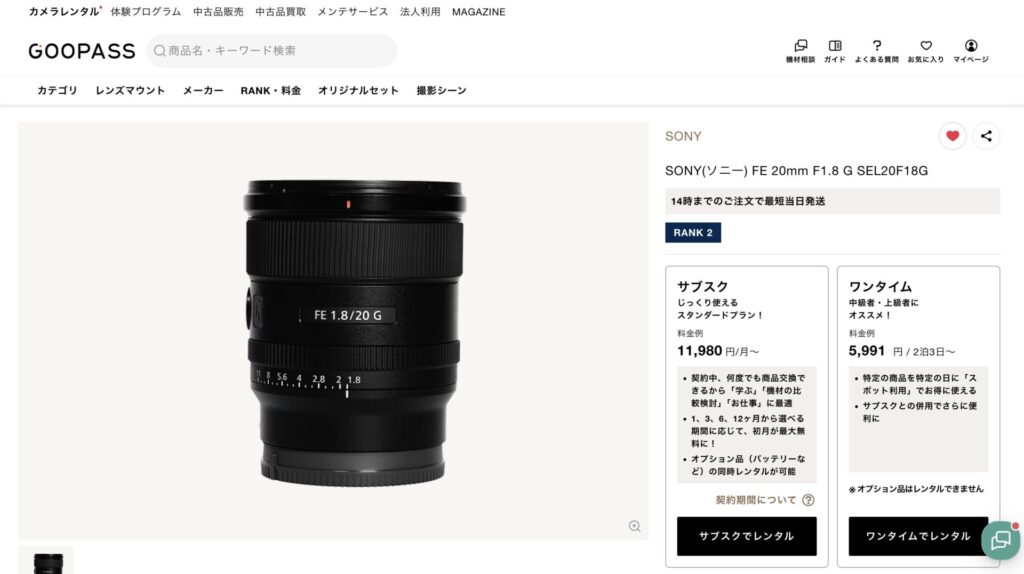 私は以前GOOPASSでFE20mm F1.8 Gをレンタルして使ったことがあります。