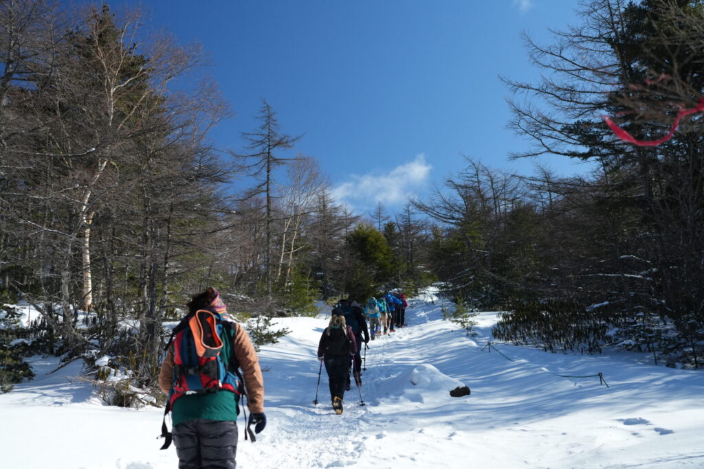 一人では心細い雪山デビューも、仲間がいれば安心感が違います(アイゼンの付け間違いも指摘してもらえますし…笑)。
